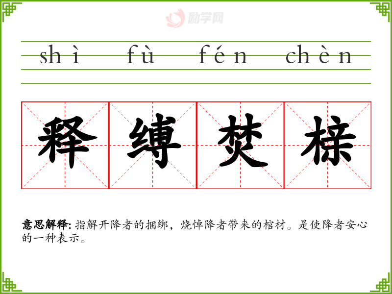 释缚焚榇的意思是:指解开降者的捆绑,烧悼降者带来的棺材。是使降者安心的一种表示。