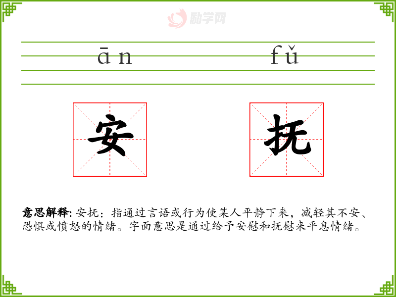 安抚:指通过言语或行为使某人平静下来,减轻其不安、恐惧或愤怒的情绪。字面意思是通过给予安慰和抚慰来平息情绪。