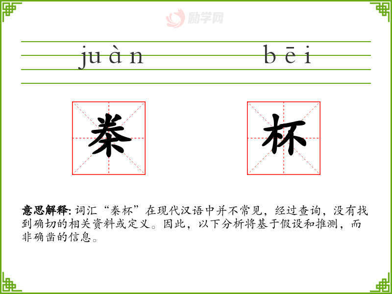 由于“桊杯”不是一个标准词汇,我们无法给出确切的字面意思和基本含义。如果“桊”是一个字,它可能是一个古字或方言字,而“杯”则通常指用于盛装液体的小容器。