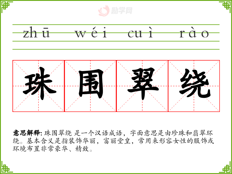 珠围翠绕 是一个汉语成语,字面意思是由珍珠和翡翠环绕。基本含义是指装饰华丽,富丽堂皇,常用来形容女性的服饰或环境布置非常豪华、精致。
