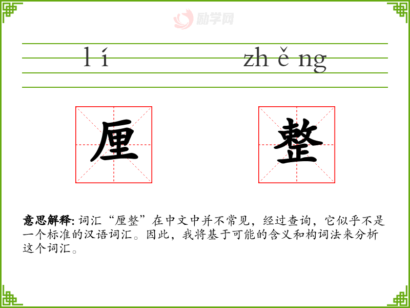 词汇“厘整”在中文中并不常见,经过查询,它似乎不是一个标准的汉语词汇。因此,我将基于可能的含义和构词法来分析这个词汇。