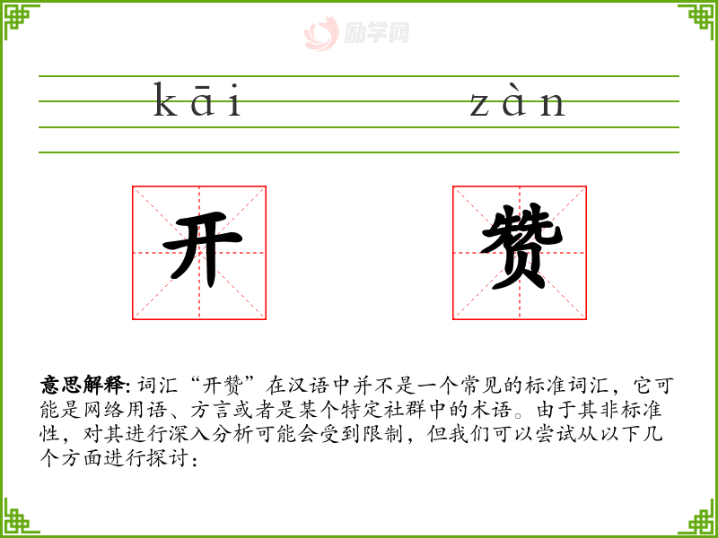 词汇“开赞”在汉语中并不是一个常见的标准词汇,它可能是网络用语、方言或者是某个特定社群中的术语。由于其非标准性,对其进行深入分析可能会受到限制,但我们可以尝试从以下几个方面进行探讨:
