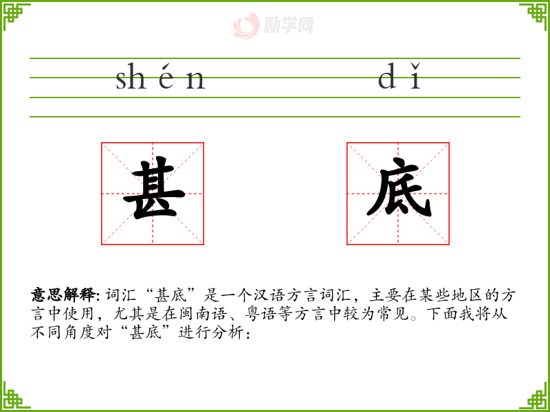 词汇“甚底”是一个汉语方言词汇,主要在某些地区的方言中使用,尤其是在闽南语、粤语等方言中较为常见。下面我将从不同角度对“甚底”进行分析:
