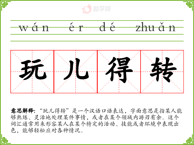 “玩儿得转”这个词汇在汉语中是一个非常生动和形象的表达,它不仅描述了某人的能力,还传达了一种积极和乐观的态度。在学*语言和表达时,掌握这样的词汇能够丰富我们的表达方式,使我们的语言更加生动和有趣。
