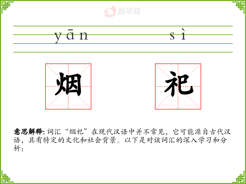 词汇“烟祀”在现代汉语中并不常见,它可能源自古代汉语,具有特定的文化和社会背景。以下是对该词汇的深入学*和分析: