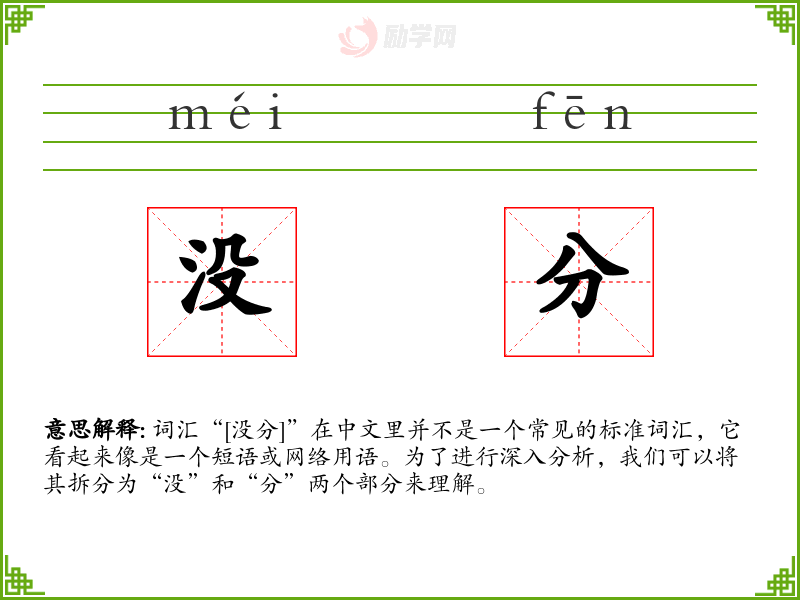 词汇“[没分]”在中文里并不是一个常见的标准词汇,它看起来像是一个短语或网络用语。为了进行深入分析,我们可以将其拆分为“没”和“分”两个部分来理解。