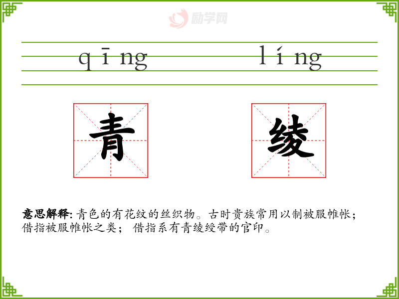 青绫的意思是:青色的有花纹的丝织物。古时贵族常用以制被服帷帐; 借指被服帷帐之类; 借指系有青绫绶带的官印。
