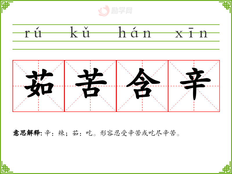 辛:辣;茹:吃。形容忍受辛苦或吃尽辛苦。
