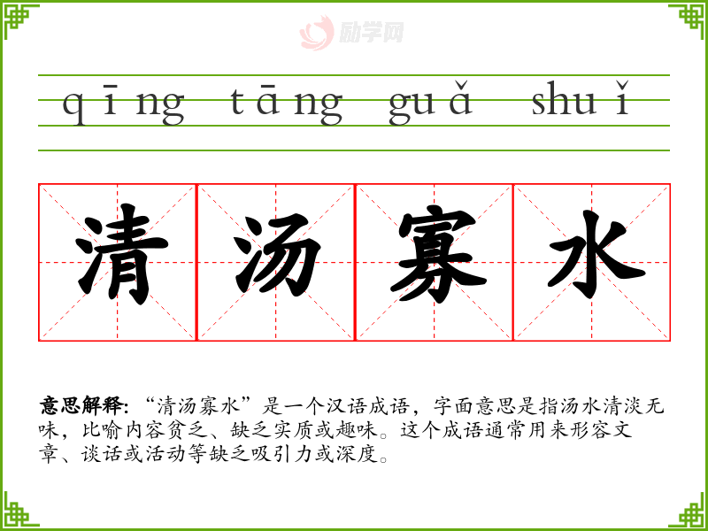 “清汤寡水”是一个汉语成语,字面意思是指汤水清淡无味,比喻内容贫乏、缺乏实质或趣味。这个成语通常用来形容文章、谈话或活动等缺乏吸引力或深度。