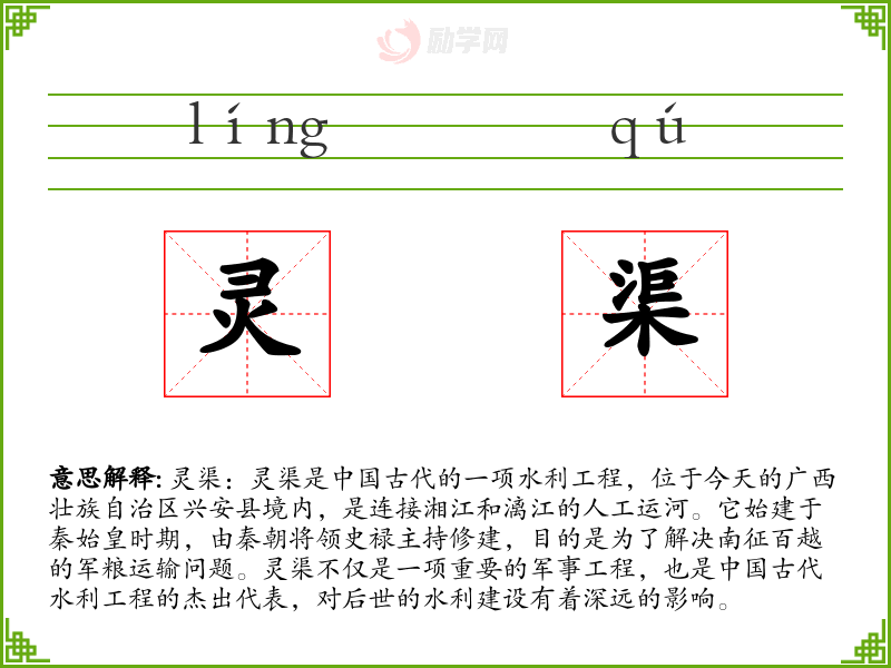 灵渠的意思是:中国古代著名水利工程。在广西境内。公元前219年秦始皇为运输军粮以进军岭南,令史禄主持开凿。长34千米。连接湘江和漓江源流,沟通长江和珠江两大水系。近代因陆上交通兴盛,该渠航道作用逐渐消失,现主要用于灌溉。全国重点文物保护单位。