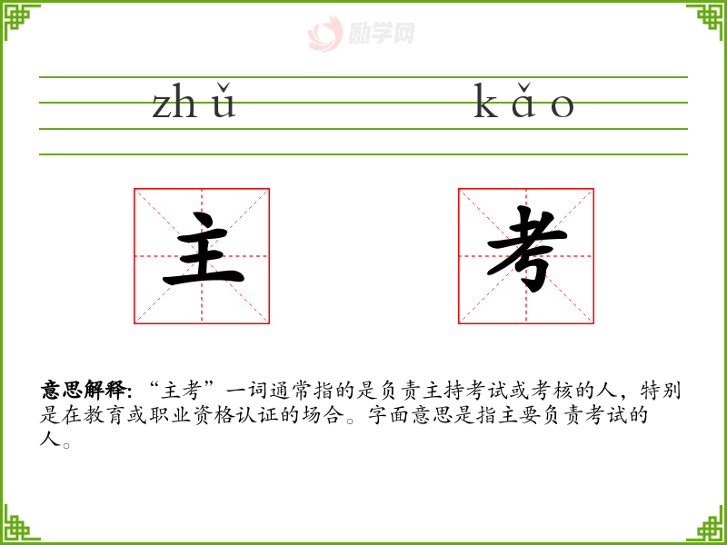 “主考”一词通常指的是负责主持考试或考核的人,特别是在教育或职业资格认证的场合。字面意思是指主要负责考试的人。