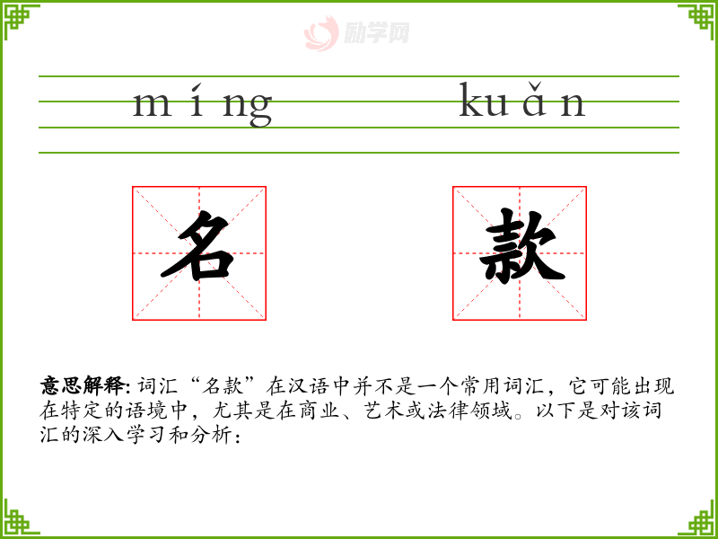 词汇“名款”在汉语中并不是一个常用词汇,它可能出现在特定的语境中,尤其是在商业、艺术或法律领域。以下是对该词汇的深入学习和分析: