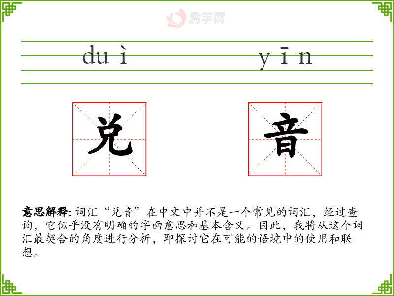 词汇“兑音”在中文中并不是一个常见的词汇,经过查询,它似乎没有明确的字面意思和基本含义。因此,我将从这个词汇最契合的角度进行分析,即探讨它在可能的语境中的使用和联想。