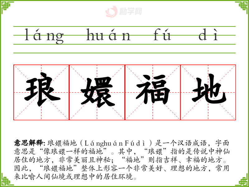 - 仙境:形容非常美丽、神秘的地方,与“琅嬛福地”意思相近。