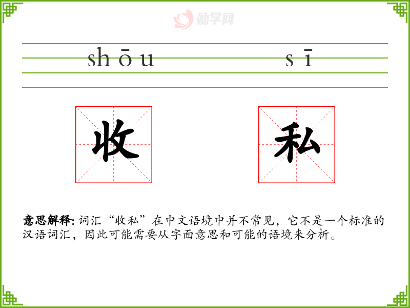 词汇“收私”在中文语境中并不常见,它不是一个标准的汉语词汇,因此可能需要从字面意思和可能的语境来分析。