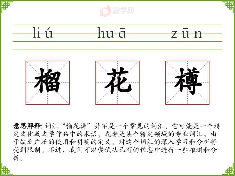 词汇“榴花樽”并不是一个常见的词汇,它可能是一个特定文化或文学作品中的术语,或者是某个特定领域的专业词汇。由于缺乏广泛的使用和明确的定义,对这个词汇的深入学*和分析将受到限制。不过,我们可以尝试从已有的信息中进行一些推测和分析。