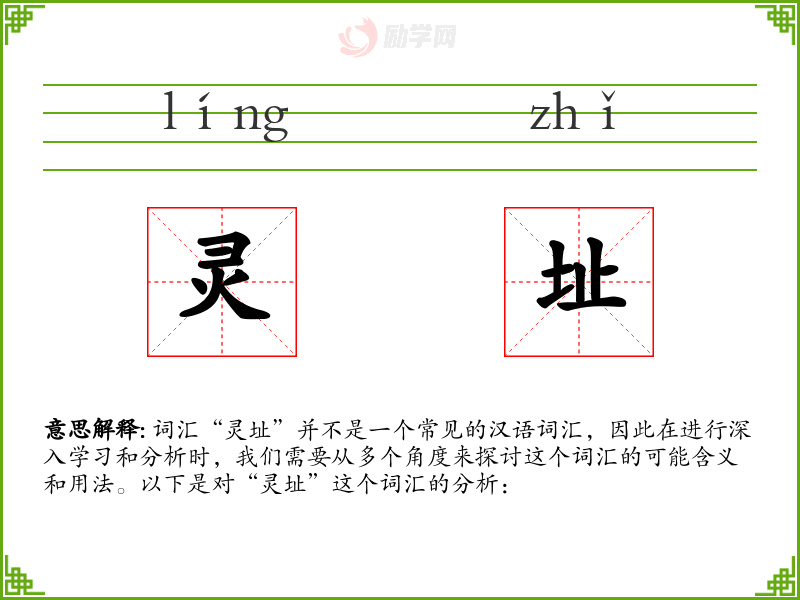 词汇“灵址”并不是一个常见的汉语词汇,因此在进行深入学*和分析时,我们需要从多个角度来探讨这个词汇的可能含义和用法。以下是对“灵址”这个词汇的分析: