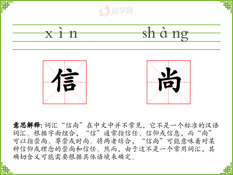 “信尚”作为一个不常见的词汇,其使用和理解需要依赖具体语境。在语言学*和表达中,了解和掌握常用词汇更为重要,而“信尚”这样的词汇可能在特定领域或文学创作中有其独特的作用。