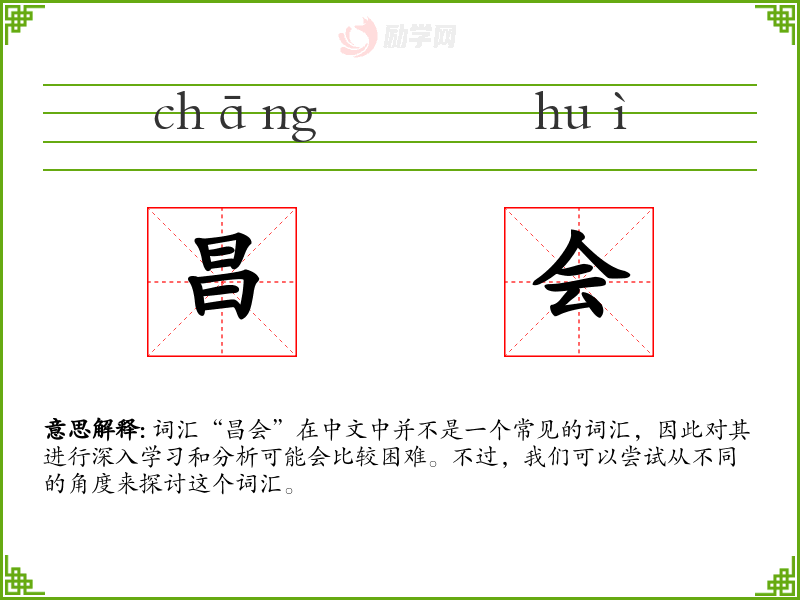 词汇“昌会”在中文中并不是一个常见的词汇,因此对其进行深入学习和分析可能会比较困难。不过,我们可以尝试从不同的角度来探讨这个词汇。