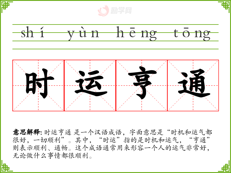 时运亨通 这个成语不仅是一个描述好运的词汇,更是一种文化符号,承载着人们对美好生活的向往和追求。在学*语言和表达时,理解和运用这样的成语能够丰富我们的词汇量,提升表达的深度和美感。