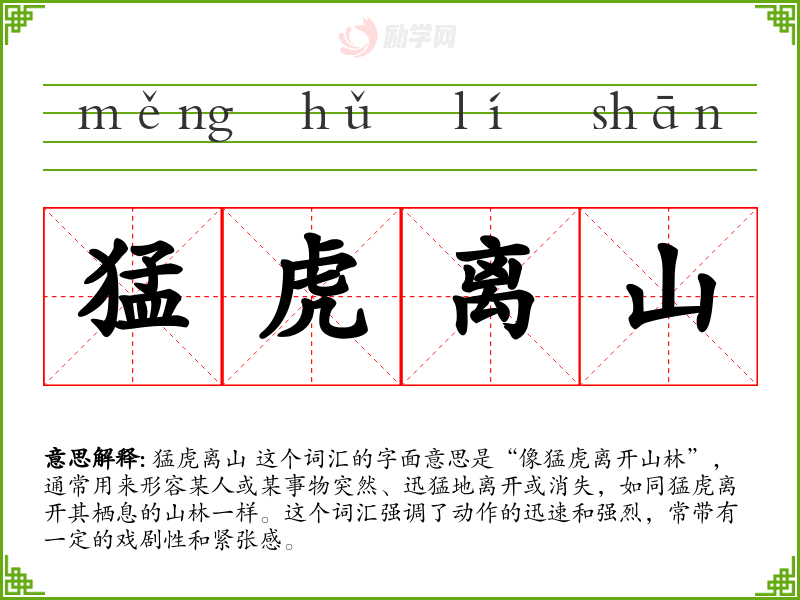 猛虎离山 这个词汇的字面意思是“像猛虎离开山林”,通常用来形容某人或某事物突然、迅猛地离开或消失,如同猛虎离开其栖息的山林一样。这个词汇强调了动作的迅速和强烈,常带有一定的戏剧性和紧张感。