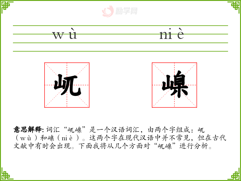 词汇“屼嵲”是一个汉语词汇,由两个字组成:屼(wù)和嵲(niè)。这两个字在现代汉语中并不常见,但在古代文献中有时会出现。下面我将从几个方面对“屼嵲”进行分析。
