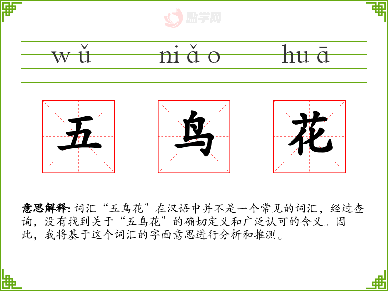 词汇“五鸟花”在汉语中并不是一个常见的词汇,经过查询,没有找到关于“五鸟花”的确切定义和广泛认可的含义。因此,我将基于这个词汇的字面意思进行分析和推测。