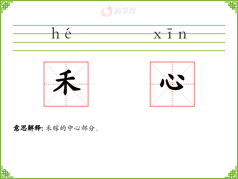 (象形。金文字形,象垂穗的禾本科农作物。汉字部首之一。从“禾”的字多与农作物有关。本义:谷类作物的总称)。