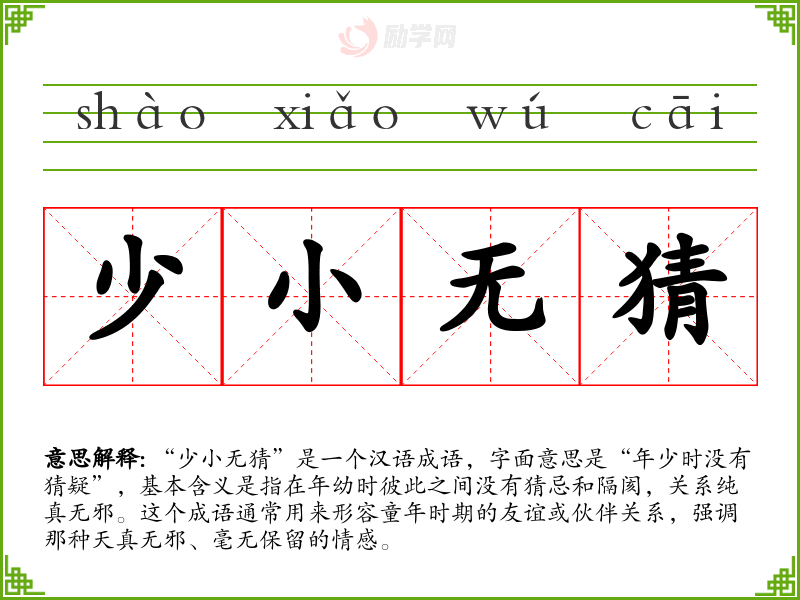 “少小无猜”是一个汉语成语,字面意思是“年少时没有猜疑”,基本含义是指在年幼时彼此之间没有猜忌和隔阂,关系纯真无邪。这个成语通常用来形容童年时期的友谊或伙伴关系,强调那种天真无邪、毫无保留的情感。