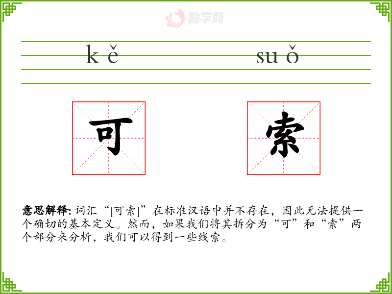 词汇“[可索]”在标准汉语中并不存在,因此无法提供一个确切的基本定义。然而,如果我们将其拆分为“可”和“索”两个部分来分析,我们可以得到一些线索。