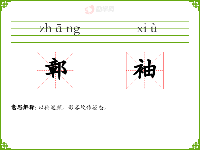 鄣袖的意思是:以袖遮颜。形容故作姿态。