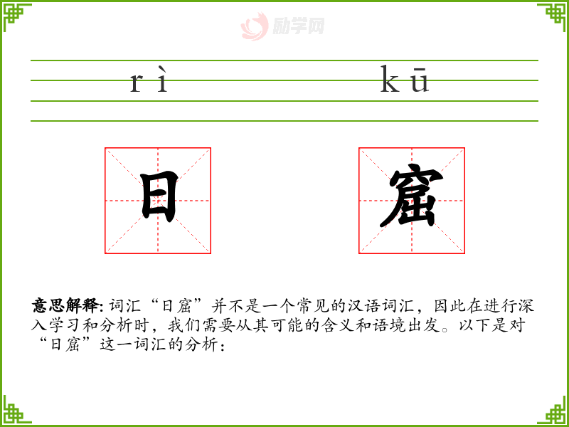 词汇“日窟”并不是一个常见的汉语词汇,因此在进行深入学习和分析时,我们需要从其可能的含义和语境出发。以下是对“日窟”这一词汇的分析: