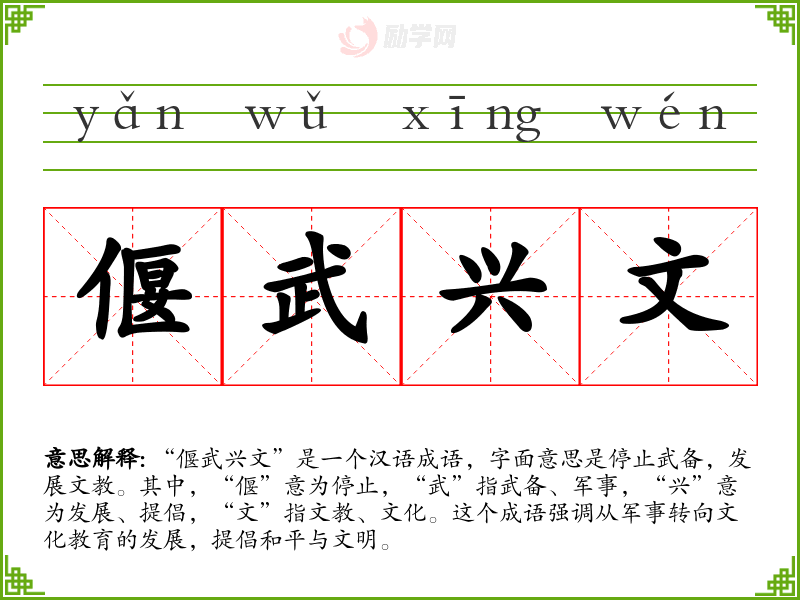 “偃武兴文”是一个汉语成语,字面意思是停止武备,发展文教。其中,“偃”意为停止,“武”指武备、军事,“兴”意为发展、提倡,“文”指文教、文化。这个成语强调从军事转向文化教育的发展,提倡和平与文明。
