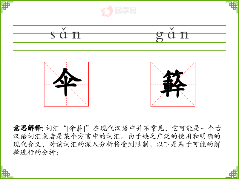 词汇“[伞簳]”在现代汉语中并不常见,它可能是一个古汉语词汇或者是某个方言中的词汇。由于缺乏广泛的使用和明确的现代含义,对该词汇的深入分析将受到限制。以下是基于可能的解释进行的分析: