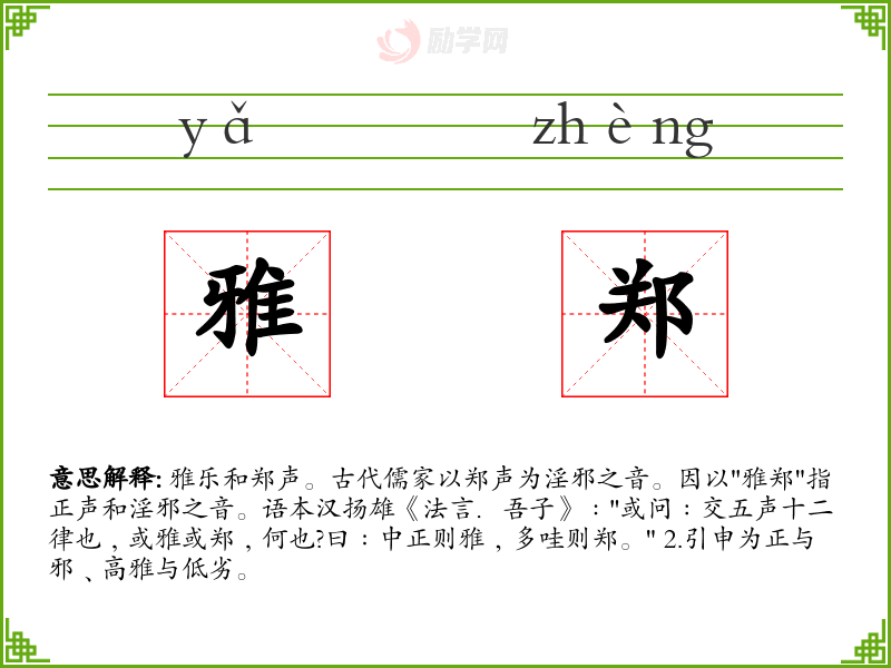 雅乐和郑声。古代儒家以郑声为淫邪之音。因以"雅郑"指正声和淫邪之音。语本汉扬雄《法言.吾子》﹕"或问﹕交五声十二律也﹐或雅或郑﹐何也?曰﹕中正则雅﹐多哇则郑。" 2.引申为正与邪﹑高雅与低劣。