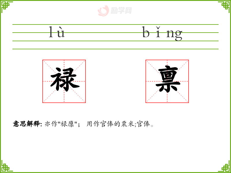 禄禀的意思是:亦作"禄廪"; 用作官俸的粟米;官俸。