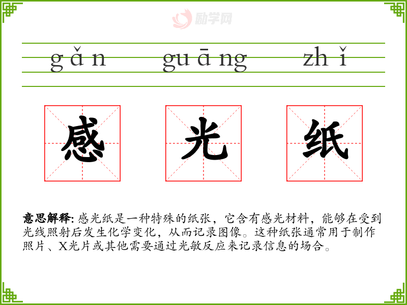 同义词:光敏纸、感光材料 反义词:非感光纸(指普通纸张,不具备感光性质)
