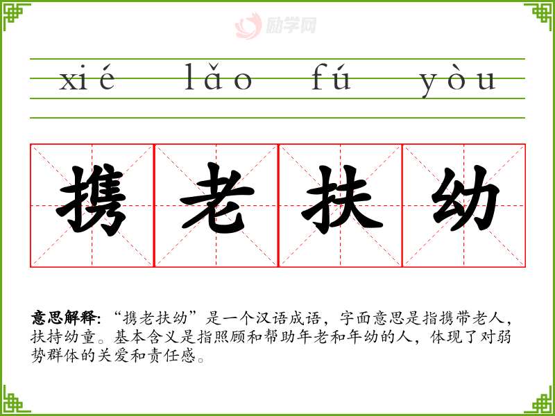 - 口语:在日常对话中,这个成语可以用来表达对某人行为的赞赏,例如:“他总是携老扶幼,真是我们社区的好榜样。”