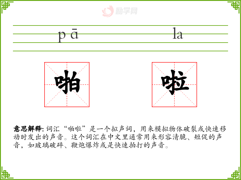 词汇“啪啦”是一个拟声词,用来模拟物体破裂或快速移动时发出的声音。这个词汇在中文里通常用来形容清脆、短促的声音,如玻璃破碎、鞭炮爆炸或是快速拍打的声音。