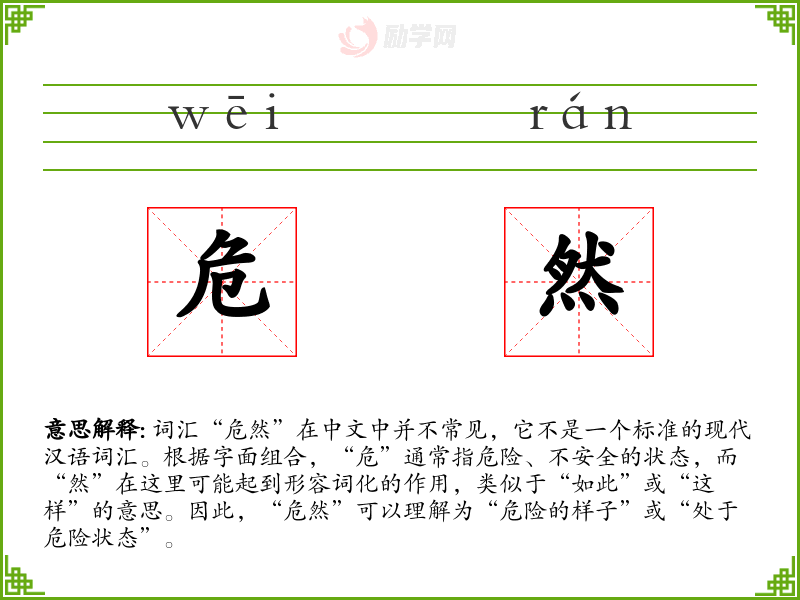 由于“危然”不是一个常用词汇,它在文学、口语或专业领域中的使用非常有限。可能在一些古文或特定文学作品中出现,用以描述某种紧张或危险的局面。