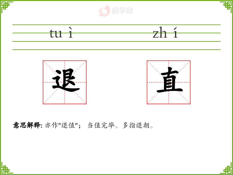 退直的意思是:亦作"退值"; 当值完毕。多指退朝。