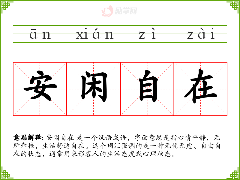 安闲自在 这个词对我来说,不仅是一种理想的生活状态,也是一种心灵的慰藉。在学*语言和表达中,它提醒我要追求内心的平静和生活的平衡。