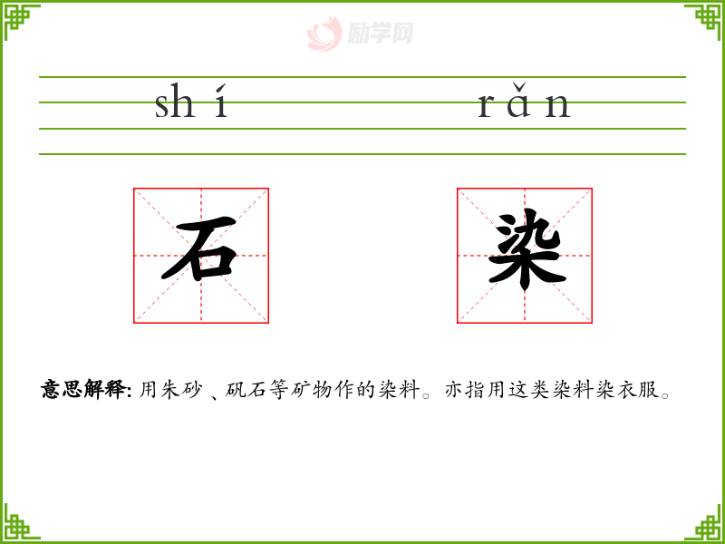 石染的意思是:用朱砂﹑矾石等矿物作的染料。亦指用这类染料染衣服。