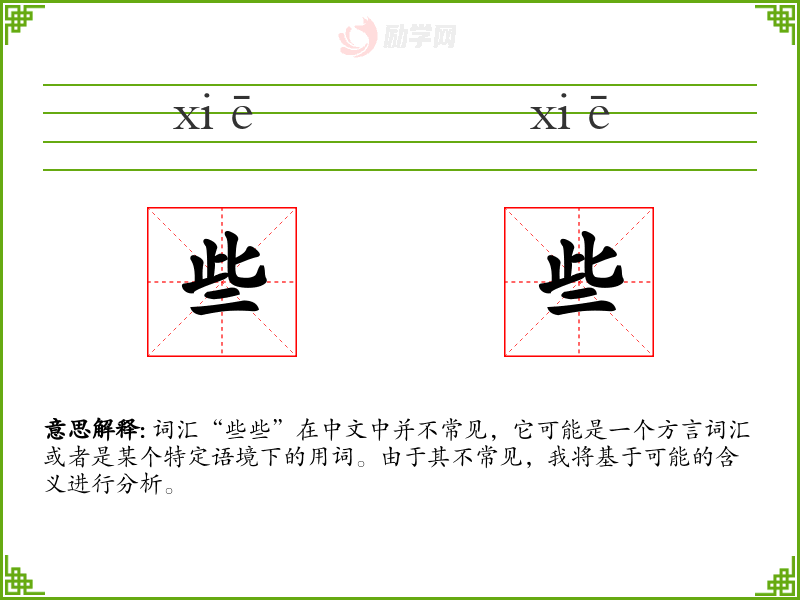 词汇“些些”在中文中并不常见,它可能是一个方言词汇或者是某个特定语境下的用词。由于其不常见,我将基于可能的含义进行分析。