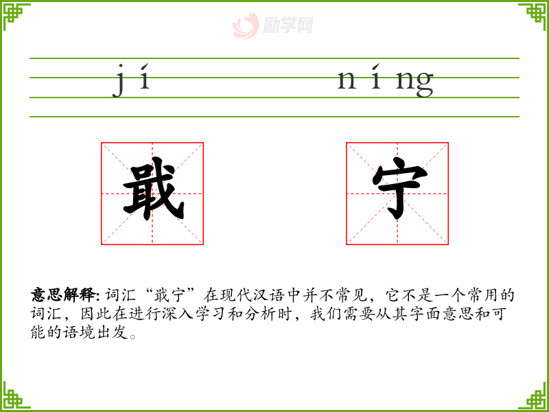 词汇“戢宁”在现代汉语中并不常见,它不是一个常用的词汇,因此在进行深入学*和分析时,我们需要从其字面意思和可能的语境出发。