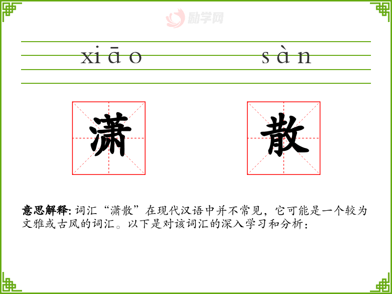 词汇“潇散”在现代汉语中并不常见,它可能是一个较为文雅或古风的词汇。以下是对该词汇的深入学*和分析: