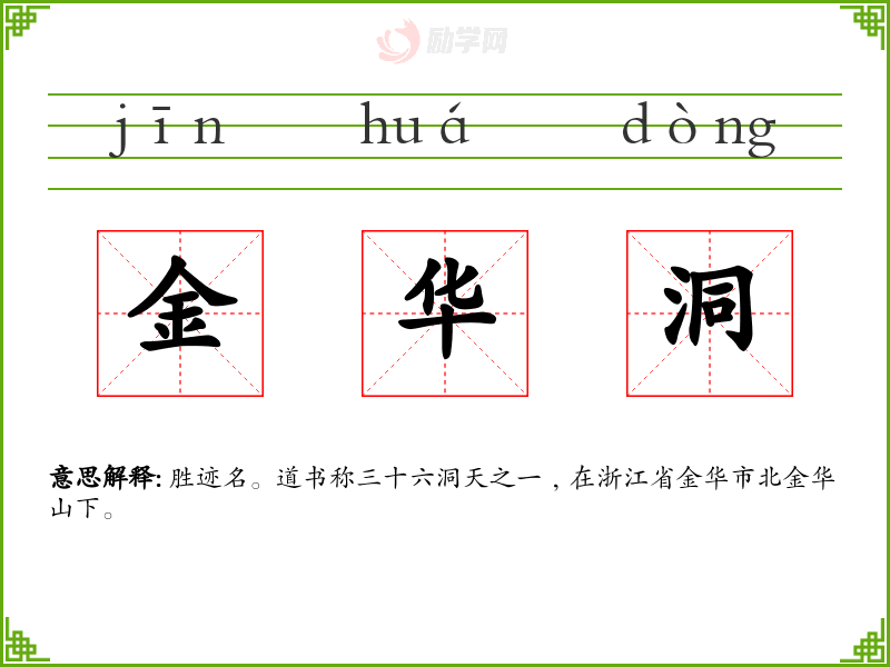 金华洞的意思是:胜迹名。道书称三十六洞天之一﹐在浙江省金华市北金华山下。