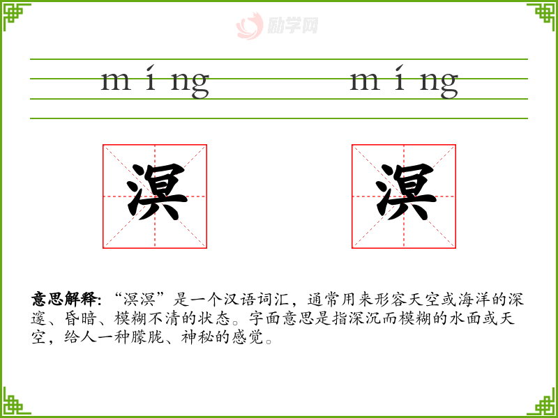 “溟溟”是一个汉语词汇,通常用来形容天空或海洋的深邃、昏暗、模糊不清的状态。字面意思是指深沉而模糊的水面或天空,给人一种朦胧、神秘的感觉。