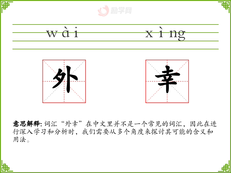 词汇“外幸”在中文里并不是一个常见的词汇,因此在进行深入学*和分析时,我们需要从多个角度来探讨其可能的含义和用法。