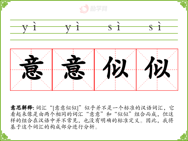 词汇“[意意似似]”似乎并不是一个标准的汉语词汇,它看起来像是由两个相同的词汇“意意”和“似似”组合而成,但这样的组合在汉语中并不常见,也没有明确的标准定义。因此,我将基于这个词汇的构成部分进行分析。
